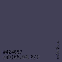 Цвет #424057 в цветовой модели RGB обозначается тремя октетами (66, 64, 87) в десятичном формате и #424057 в шестнадцатиричном (hex) формате, которые являются интенсивностью красного 66 (hex 42), интенсивность зелёного 64 (hex 40) и интенсивность синего 87 (hex 57).