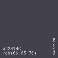 Цвет #42414C в цветовой модели RGB обозначается тремя октетами (66, 65, 76) в десятичном формате и #42414C в шестнадцатиричном (hex) формате, которые являются интенсивностью красного 66 (hex 42), интенсивность зелёного 65 (hex 41) и интенсивность синего 76 (hex 4C).