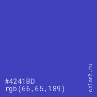 Цвет #4241BD в цветовой модели RGB обозначается тремя октетами (66, 65, 189) в десятичном формате и #4241BD в шестнадцатиричном (hex) формате, которые являются интенсивностью красного 66 (hex 42), интенсивность зелёного 65 (hex 41) и интенсивность синего 189 (hex BD).