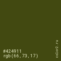 Цвет #424911 в цветовой модели RGB обозначается тремя октетами (66, 73, 17) в десятичном формате и #424911 в шестнадцатиричном (hex) формате, которые являются интенсивностью красного 66 (hex 42), интенсивность зелёного 73 (hex 49) и интенсивность синего 17 (hex 11).