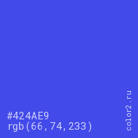 Цвет #424AE9 в цветовой модели RGB обозначается тремя октетами (66, 74, 233) в десятичном формате и #424AE9 в шестнадцатиричном (hex) формате, которые являются интенсивностью красного 66 (hex 42), интенсивность зелёного 74 (hex 4A) и интенсивность синего 233 (hex E9).
