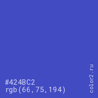 Цвет #424BC2 в цветовой модели RGB обозначается тремя октетами (66, 75, 194) в десятичном формате и #424BC2 в шестнадцатиричном (hex) формате, которые являются интенсивностью красного 66 (hex 42), интенсивность зелёного 75 (hex 4B) и интенсивность синего 194 (hex C2).
