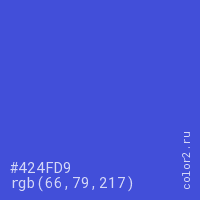 Цвет #424FD9 в цветовой модели RGB обозначается тремя октетами (66, 79, 217) в десятичном формате и #424FD9 в шестнадцатиричном (hex) формате, которые являются интенсивностью красного 66 (hex 42), интенсивность зелёного 79 (hex 4F) и интенсивность синего 217 (hex D9).