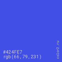 Цвет #424FE7 в цветовой модели RGB обозначается тремя октетами (66, 79, 231) в десятичном формате и #424FE7 в шестнадцатиричном (hex) формате, которые являются интенсивностью красного 66 (hex 42), интенсивность зелёного 79 (hex 4F) и интенсивность синего 231 (hex E7).
