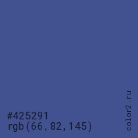 Цвет #425291 в цветовой модели RGB обозначается тремя октетами (66, 82, 145) в десятичном формате и #425291 в шестнадцатиричном (hex) формате, которые являются интенсивностью красного 66 (hex 42), интенсивность зелёного 82 (hex 52) и интенсивность синего 145 (hex 91).
