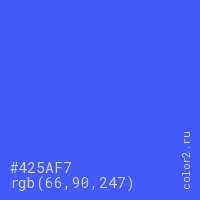 Цвет #425AF7 в цветовой модели RGB обозначается тремя октетами (66, 90, 247) в десятичном формате и #425AF7 в шестнадцатиричном (hex) формате, которые являются интенсивностью красного 66 (hex 42), интенсивность зелёного 90 (hex 5A) и интенсивность синего 247 (hex F7).
