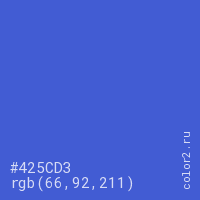 Цвет #425CD3 в цветовой модели RGB обозначается тремя октетами (66, 92, 211) в десятичном формате и #425CD3 в шестнадцатиричном (hex) формате, которые являются интенсивностью красного 66 (hex 42), интенсивность зелёного 92 (hex 5C) и интенсивность синего 211 (hex D3).