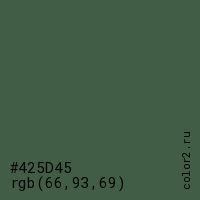 Цвет #425D45 в цветовой модели RGB обозначается тремя октетами (66, 93, 69) в десятичном формате и #425D45 в шестнадцатиричном (hex) формате, которые являются интенсивностью красного 66 (hex 42), интенсивность зелёного 93 (hex 5D) и интенсивность синего 69 (hex 45).
