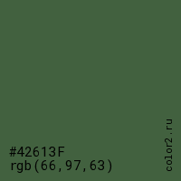 Цвет #42613F в цветовой модели RGB обозначается тремя октетами (66, 97, 63) в десятичном формате и #42613F в шестнадцатиричном (hex) формате, которые являются интенсивностью красного 66 (hex 42), интенсивность зелёного 97 (hex 61) и интенсивность синего 63 (hex 3F).