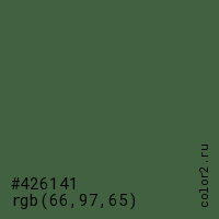 Цвет #426141 в цветовой модели RGB обозначается тремя октетами (66, 97, 65) в десятичном формате и #426141 в шестнадцатиричном (hex) формате, которые являются интенсивностью красного 66 (hex 42), интенсивность зелёного 97 (hex 61) и интенсивность синего 65 (hex 41).