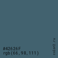 Цвет #42626F в цветовой модели RGB обозначается тремя октетами (66, 98, 111) в десятичном формате и #42626F в шестнадцатиричном (hex) формате, которые являются интенсивностью красного 66 (hex 42), интенсивность зелёного 98 (hex 62) и интенсивность синего 111 (hex 6F).