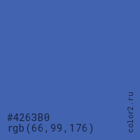 Цвет #4263B0 в цветовой модели RGB обозначается тремя октетами (66, 99, 176) в десятичном формате и #4263B0 в шестнадцатиричном (hex) формате, которые являются интенсивностью красного 66 (hex 42), интенсивность зелёного 99 (hex 63) и интенсивность синего 176 (hex B0).