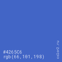 Цвет #4265C6 в цветовой модели RGB обозначается тремя октетами (66, 101, 198) в десятичном формате и #4265C6 в шестнадцатиричном (hex) формате, которые являются интенсивностью красного 66 (hex 42), интенсивность зелёного 101 (hex 65) и интенсивность синего 198 (hex C6).