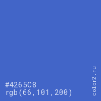 Цвет #4265C8 в цветовой модели RGB обозначается тремя октетами (66, 101, 200) в десятичном формате и #4265C8 в шестнадцатиричном (hex) формате, которые являются интенсивностью красного 66 (hex 42), интенсивность зелёного 101 (hex 65) и интенсивность синего 200 (hex C8).