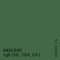 Цвет #426845 в цветовой модели RGB обозначается тремя октетами (66, 104, 69) в десятичном формате и #426845 в шестнадцатиричном (hex) формате, которые являются интенсивностью красного 66 (hex 42), интенсивность зелёного 104 (hex 68) и интенсивность синего 69 (hex 45).