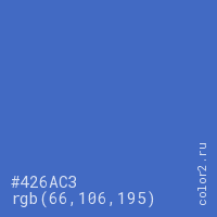 Цвет #426AC3 в цветовой модели RGB обозначается тремя октетами (66, 106, 195) в десятичном формате и #426AC3 в шестнадцатиричном (hex) формате, которые являются интенсивностью красного 66 (hex 42), интенсивность зелёного 106 (hex 6A) и интенсивность синего 195 (hex C3).
