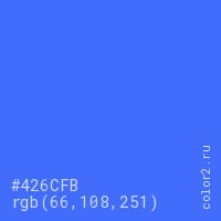 Цвет #426CFB в цветовой модели RGB обозначается тремя октетами (66, 108, 251) в десятичном формате и #426CFB в шестнадцатиричном (hex) формате, которые являются интенсивностью красного 66 (hex 42), интенсивность зелёного 108 (hex 6C) и интенсивность синего 251 (hex FB).
