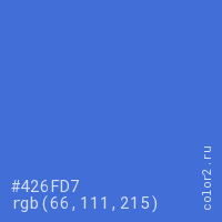 Цвет #426FD7 в цветовой модели RGB обозначается тремя октетами (66, 111, 215) в десятичном формате и #426FD7 в шестнадцатиричном (hex) формате, которые являются интенсивностью красного 66 (hex 42), интенсивность зелёного 111 (hex 6F) и интенсивность синего 215 (hex D7).