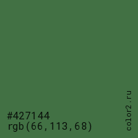 Цвет #427144 в цветовой модели RGB обозначается тремя октетами (66, 113, 68) в десятичном формате и #427144 в шестнадцатиричном (hex) формате, которые являются интенсивностью красного 66 (hex 42), интенсивность зелёного 113 (hex 71) и интенсивность синего 68 (hex 44).