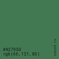 Цвет #427953 в цветовой модели RGB обозначается тремя октетами (66, 121, 83) в десятичном формате и #427953 в шестнадцатиричном (hex) формате, которые являются интенсивностью красного 66 (hex 42), интенсивность зелёного 121 (hex 79) и интенсивность синего 83 (hex 53).