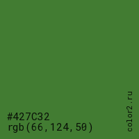 Цвет #427C32 в цветовой модели RGB обозначается тремя октетами (66, 124, 50) в десятичном формате и #427C32 в шестнадцатиричном (hex) формате, которые являются интенсивностью красного 66 (hex 42), интенсивность зелёного 124 (hex 7C) и интенсивность синего 50 (hex 32).