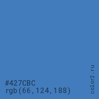 Цвет #427CBC в цветовой модели RGB обозначается тремя октетами (66, 124, 188) в десятичном формате и #427CBC в шестнадцатиричном (hex) формате, которые являются интенсивностью красного 66 (hex 42), интенсивность зелёного 124 (hex 7C) и интенсивность синего 188 (hex BC).