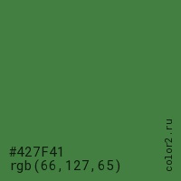 Цвет #427F41 в цветовой модели RGB обозначается тремя октетами (66, 127, 65) в десятичном формате и #427F41 в шестнадцатиричном (hex) формате, которые являются интенсивностью красного 66 (hex 42), интенсивность зелёного 127 (hex 7F) и интенсивность синего 65 (hex 41).