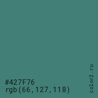 Цвет #427F76 в цветовой модели RGB обозначается тремя октетами (66, 127, 118) в десятичном формате и #427F76 в шестнадцатиричном (hex) формате, которые являются интенсивностью красного 66 (hex 42), интенсивность зелёного 127 (hex 7F) и интенсивность синего 118 (hex 76).