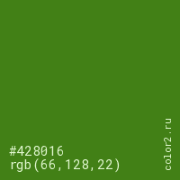 Цвет #428016 в цветовой модели RGB обозначается тремя октетами (66, 128, 22) в десятичном формате и #428016 в шестнадцатиричном (hex) формате, которые являются интенсивностью красного 66 (hex 42), интенсивность зелёного 128 (hex 80) и интенсивность синего 22 (hex 16).