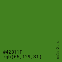 Цвет #42811F в цветовой модели RGB обозначается тремя октетами (66, 129, 31) в десятичном формате и #42811F в шестнадцатиричном (hex) формате, которые являются интенсивностью красного 66 (hex 42), интенсивность зелёного 129 (hex 81) и интенсивность синего 31 (hex 1F).