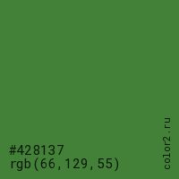 Цвет #428137 в цветовой модели RGB обозначается тремя октетами (66, 129, 55) в десятичном формате и #428137 в шестнадцатиричном (hex) формате, которые являются интенсивностью красного 66 (hex 42), интенсивность зелёного 129 (hex 81) и интенсивность синего 55 (hex 37).