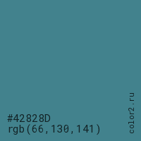 Цвет #42828D в цветовой модели RGB обозначается тремя октетами (66, 130, 141) в десятичном формате и #42828D в шестнадцатиричном (hex) формате, которые являются интенсивностью красного 66 (hex 42), интенсивность зелёного 130 (hex 82) и интенсивность синего 141 (hex 8D).