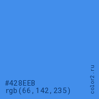 Цвет #428EEB в цветовой модели RGB обозначается тремя октетами (66, 142, 235) в десятичном формате и #428EEB в шестнадцатиричном (hex) формате, которые являются интенсивностью красного 66 (hex 42), интенсивность зелёного 142 (hex 8E) и интенсивность синего 235 (hex EB).