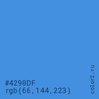 Цвет #4290DF в цветовой модели RGB обозначается тремя октетами (66, 144, 223) в десятичном формате и #4290DF в шестнадцатиричном (hex) формате, которые являются интенсивностью красного 66 (hex 42), интенсивность зелёного 144 (hex 90) и интенсивность синего 223 (hex DF).