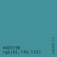 Цвет #42919B в цветовой модели RGB обозначается тремя октетами (66, 145, 155) в десятичном формате и #42919B в шестнадцатиричном (hex) формате, которые являются интенсивностью красного 66 (hex 42), интенсивность зелёного 145 (hex 91) и интенсивность синего 155 (hex 9B).