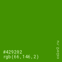 Цвет #429202 в цветовой модели RGB обозначается тремя октетами (66, 146, 2) в десятичном формате и #429202 в шестнадцатиричном (hex) формате, которые являются интенсивностью красного 66 (hex 42), интенсивность зелёного 146 (hex 92) и интенсивность синего 2 (hex 02).