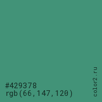 Цвет #429378 в цветовой модели RGB обозначается тремя октетами (66, 147, 120) в десятичном формате и #429378 в шестнадцатиричном (hex) формате, которые являются интенсивностью красного 66 (hex 42), интенсивность зелёного 147 (hex 93) и интенсивность синего 120 (hex 78).