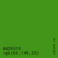 Цвет #429519 в цветовой модели RGB обозначается тремя октетами (66, 149, 25) в десятичном формате и #429519 в шестнадцатиричном (hex) формате, которые являются интенсивностью красного 66 (hex 42), интенсивность зелёного 149 (hex 95) и интенсивность синего 25 (hex 19).