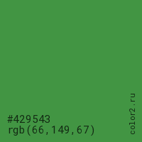 Цвет #429543 в цветовой модели RGB обозначается тремя октетами (66, 149, 67) в десятичном формате и #429543 в шестнадцатиричном (hex) формате, которые являются интенсивностью красного 66 (hex 42), интенсивность зелёного 149 (hex 95) и интенсивность синего 67 (hex 43).