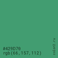Цвет #429D70 в цветовой модели RGB обозначается тремя октетами (66, 157, 112) в десятичном формате и #429D70 в шестнадцатиричном (hex) формате, которые являются интенсивностью красного 66 (hex 42), интенсивность зелёного 157 (hex 9D) и интенсивность синего 112 (hex 70).