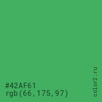 Цвет #42AF61 в цветовой модели RGB обозначается тремя октетами (66, 175, 97) в десятичном формате и #42AF61 в шестнадцатиричном (hex) формате, которые являются интенсивностью красного 66 (hex 42), интенсивность зелёного 175 (hex AF) и интенсивность синего 97 (hex 61).