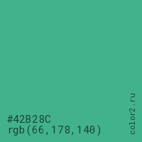 Цвет #42B28C в цветовой модели RGB обозначается тремя октетами (66, 178, 140) в десятичном формате и #42B28C в шестнадцатиричном (hex) формате, которые являются интенсивностью красного 66 (hex 42), интенсивность зелёного 178 (hex B2) и интенсивность синего 140 (hex 8C).
