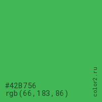 Цвет #42B756 в цветовой модели RGB обозначается тремя октетами (66, 183, 86) в десятичном формате и #42B756 в шестнадцатиричном (hex) формате, которые являются интенсивностью красного 66 (hex 42), интенсивность зелёного 183 (hex B7) и интенсивность синего 86 (hex 56).