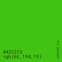 Цвет #42C213 в цветовой модели RGB обозначается тремя октетами (66, 194, 19) в десятичном формате и #42C213 в шестнадцатиричном (hex) формате, которые являются интенсивностью красного 66 (hex 42), интенсивность зелёного 194 (hex C2) и интенсивность синего 19 (hex 13).