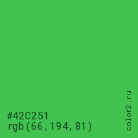 Цвет #42C251 в цветовой модели RGB обозначается тремя октетами (66, 194, 81) в десятичном формате и #42C251 в шестнадцатиричном (hex) формате, которые являются интенсивностью красного 66 (hex 42), интенсивность зелёного 194 (hex C2) и интенсивность синего 81 (hex 51).