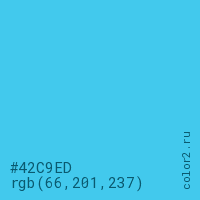 Цвет #42C9ED в цветовой модели RGB обозначается тремя октетами (66, 201, 237) в десятичном формате и #42C9ED в шестнадцатиричном (hex) формате, которые являются интенсивностью красного 66 (hex 42), интенсивность зелёного 201 (hex C9) и интенсивность синего 237 (hex ED).