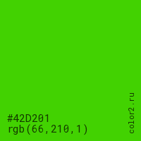 Цвет #42D201 в цветовой модели RGB обозначается тремя октетами (66, 210, 1) в десятичном формате и #42D201 в шестнадцатиричном (hex) формате, которые являются интенсивностью красного 66 (hex 42), интенсивность зелёного 210 (hex D2) и интенсивность синего 1 (hex 01).