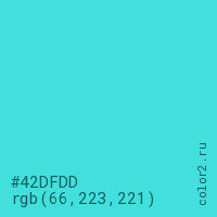 Цвет #42DFDD в цветовой модели RGB обозначается тремя октетами (66, 223, 221) в десятичном формате и #42DFDD в шестнадцатиричном (hex) формате, которые являются интенсивностью красного 66 (hex 42), интенсивность зелёного 223 (hex DF) и интенсивность синего 221 (hex DD).