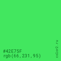 Цвет #42E75F в цветовой модели RGB обозначается тремя октетами (66, 231, 95) в десятичном формате и #42E75F в шестнадцатиричном (hex) формате, которые являются интенсивностью красного 66 (hex 42), интенсивность зелёного 231 (hex E7) и интенсивность синего 95 (hex 5F).
