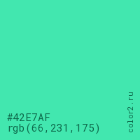 Цвет #42E7AF в цветовой модели RGB обозначается тремя октетами (66, 231, 175) в десятичном формате и #42E7AF в шестнадцатиричном (hex) формате, которые являются интенсивностью красного 66 (hex 42), интенсивность зелёного 231 (hex E7) и интенсивность синего 175 (hex AF).